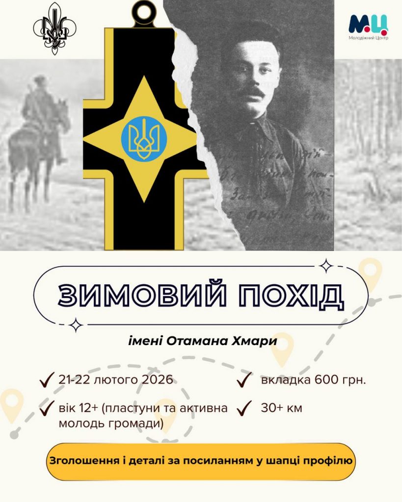 Пласт Хмельницький спільно з Молодіжним Центром вдруге закликають відчайдухів з Хмельницького та інших країв кинути виклик своїм можливостям і вирушити в символічний Зимовий похід в пам’ять про подільського отамана Хмару – Семена Харченка та героїчні сторінки Визвольних змагань 1917-1924 рр.!